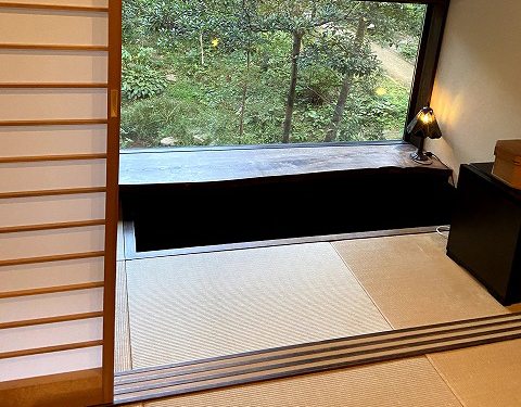 今回宿泊したのは本館の「あせび」という客室です。6畳+2畳のウッドカウンター付き和室です。6畳のお部屋は4人入ると少し狭い感じがしますが、キレイで素敵なお部屋でした。ウッドカウンターからはお庭の豊かな緑が見渡せて景色は最高です。